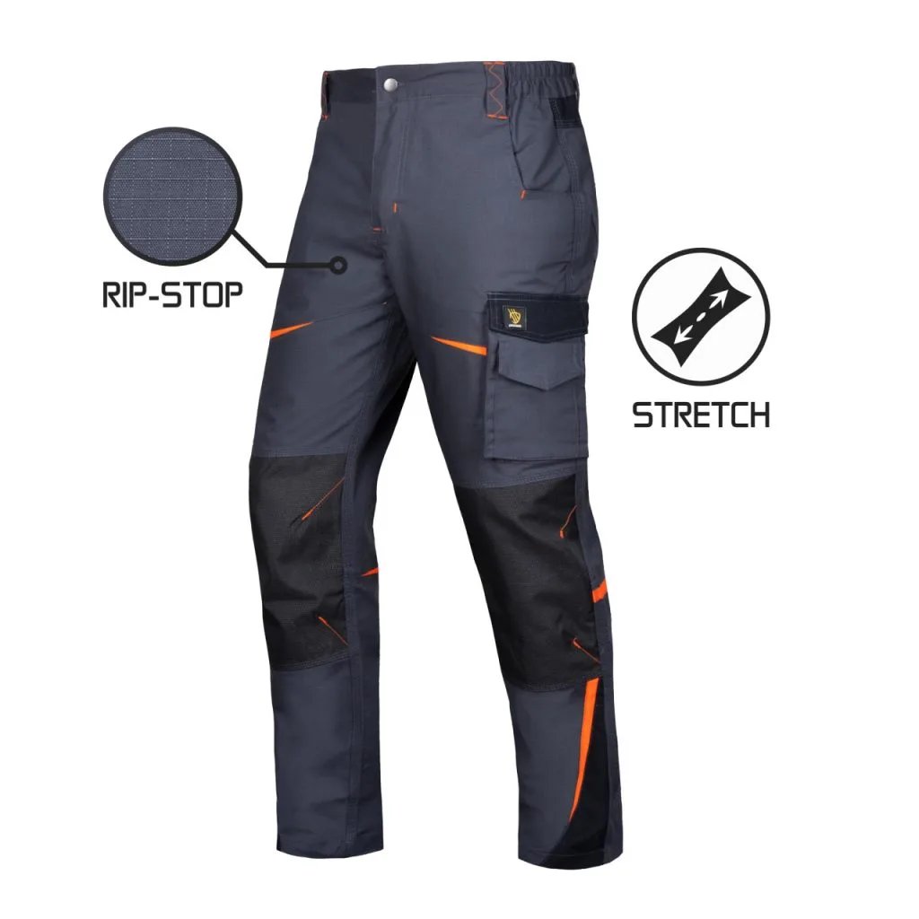 Pantalone izrađene od visokokvalitetne elastične rastezljive tkanine sa RIP-STOP tkanjem i sastavom: 58% pamuk, 40% poliester, 2% spandex težine 240 g/m^2. Imaju mnogo funkcionalnih džepova, uključujući dva prednja džepa, dva dupla džepa na butinama i dva zadnja džepa. Njihov izuzetno praktičan kroj i elastičan materijal pružaju maksimalnu slobodu kretanja. Pojačanja od materijala koji štite od habanja na nogama. Ojačane šipke i trostruki šavovi povećavaju izdržljivost. Pokazaće se korisnim i na poslu i tokom rekreativnih aktivnosti. Moderne boje i dizajn.
