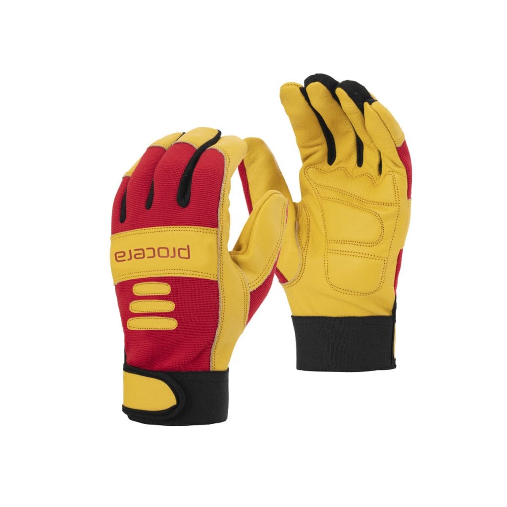 Radne rukavice od najkvalitetnije žute kozje kože, gornji dio od rastegljivog spandex materijala ojačan kožnim umetcima i kožnim pojačanjima na vrhovima prstiju. U unutrašnjem dijelu za hvatanje, dodatni umetci od mekog EVA materijala koji prigušuju vibracije i udare, povećavaju udobnost korištenja i osjećaj mekog prianjanja. Način šivanja palca kao zasebnog elementa osigurava fleksibilnost i daje ergonomski oblik. Pričvršćuje se čičak trakom. Kategorija I.