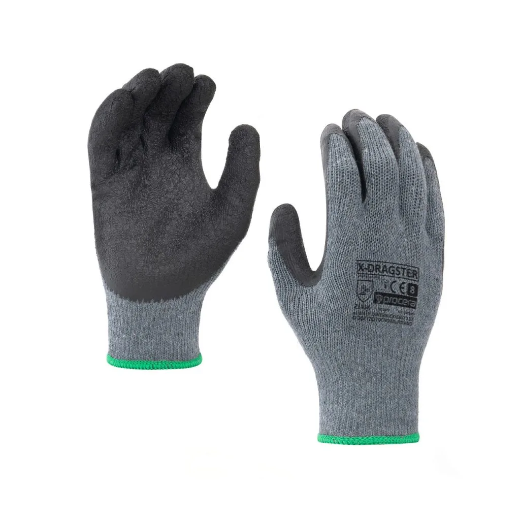 X-DRAGSTER rukavice od pletenog poliestera i pamuka u sivoj boji, presvučene u rukohvatnom dijelu lateksom hrapave strukture. Vrlo dobro prianjanje. Završeno s vezicom. CE EN 388. Pakovanje: karton 12/120. Boja: siva/crna.